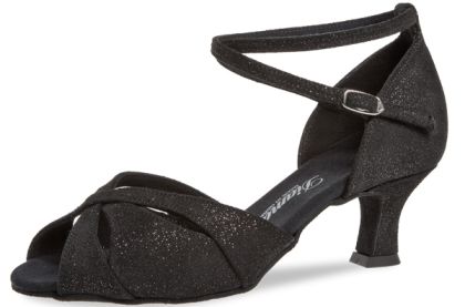 Diese Diamant Damen Latein Tanzschuhe sind handgefertigt in Deutschland und verfügen über ein Vorderblatt aus drei übereinander liegenden Flügeln, die sich perfekt dem Fuß anpassen. Die zehenoffene Sandalette wird mit einer stufenlos einstellbaren Druckknopfschnalle an einem überkreuzenden Fersenriemchen befestigt, was ein schnelles Öffnen und Schließen ermöglicht. Der Tanzschuh ist speziell für kräftige Füße in der Weite G konzipiert und verfügt über einen eleganten 5 cm Latino Absatz. Das Innenfutter besteht aus atmungsaktivem und feuchtigkeitsabsorbierendem Microfaser, das in Italien hergestellt wird. Das Obermaterial besteht aus schwarzem Velour mit einer silbernen Reflexion und wird aus weichem Velourleder mit Silberveredelung aus Italien gefertigt.
