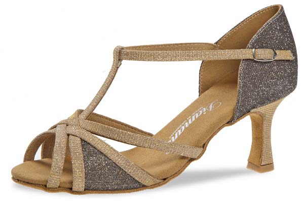 Damen Latein Tanzschuhe Made in Germany handgefertigt mit Steg und mehrteiligem Vorderblatt. Die zehenoffene Sandalette wird mit einer stufenlos einstellbaren Druckknopfschnalle zum schnellen Öffnen und Schließen gefertigt. Dieser Tanzschuh wird in der Weite F (Normalweite) mit einem eleganten 6,5 cm Flare Absatz hergestellt. Als Innenauskleidung wird ein atmungsaktives und Feuchtigkeit absorbierendes Microfaser aus italienischer Premium-Herstellung eingearbeitet. Für die Obermaterialien aus beige Brokat Goldschimmer kombiniert mit bronze Brokat werden hochwertige Brokat-Materialien aus England verwendet.
