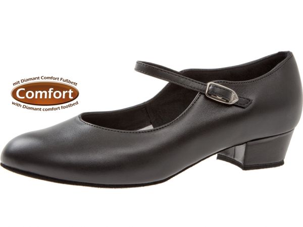 Diamant ladies standard dance shoes made in Germany handcrafted in classic style with a rounded front. The closed toe pumps is featured with a infinitely variable push-button system for fast opening and closing on a heel strap. This dance shoe with round toe cap is manufactured in width F (regular width) equipped with Diamant comfort footbed and a stable 2,8 cm bloc heel with a very large heel area. As interior lining a breathable, antibacterial and moisture-absorbent microfiber from an Italian premium producer is used. For the upper material made out of black leather a high-class nappa from Italy is used.